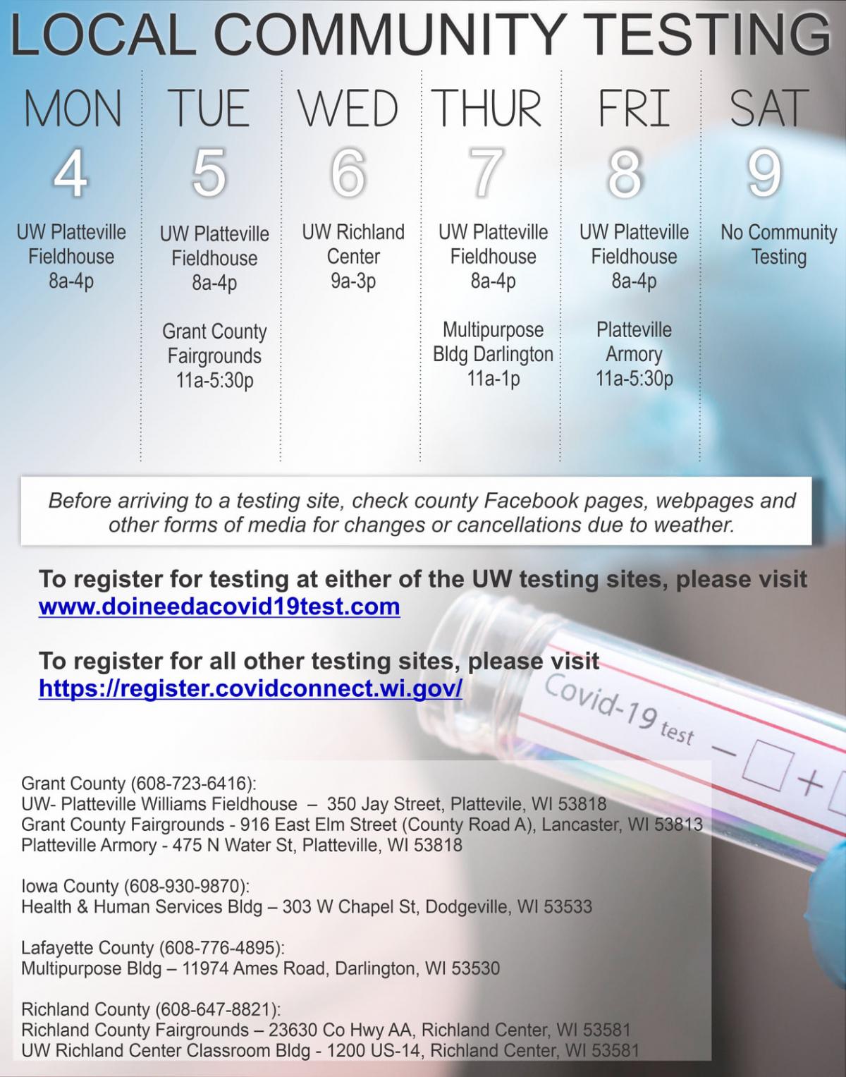 Free Covid 19 Local Testing Sites January 4 9 2021 Platteville Wisconsin